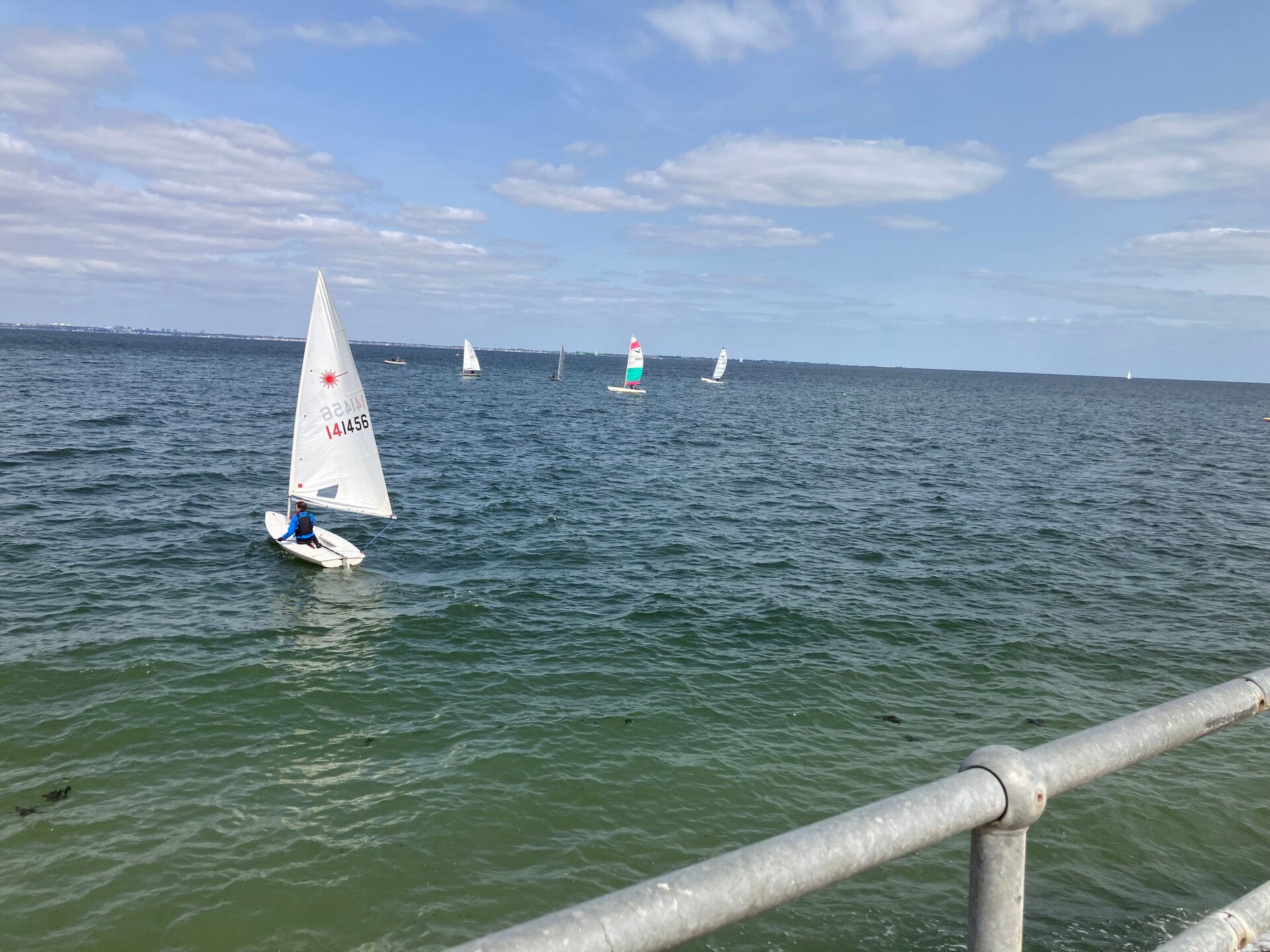 A new day and fresh optimism. The wind started as SSW 15kts with the forecast to build throughout the day. The course was set and the big powerful Ospreys got off the line, 1116 making the most of a fairly conservative start by fleet. They held the lead rounding the windward mark followed by 1292 and 1383. The fleet bunched on the run, 1292 (Heather/Osgoods) over taking 1116 (Carroll Brothers). 1383 also creeping ahead but went wide out of the turn allowing the brothers to sneak inside.