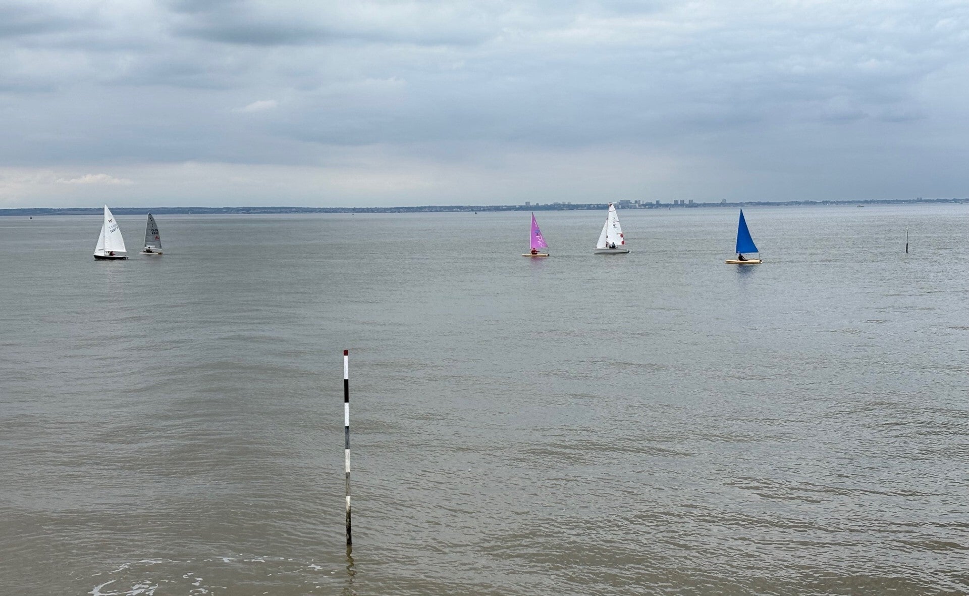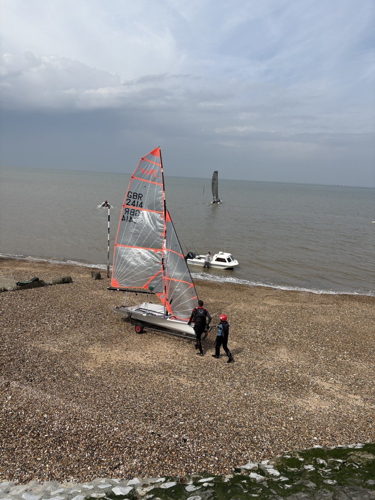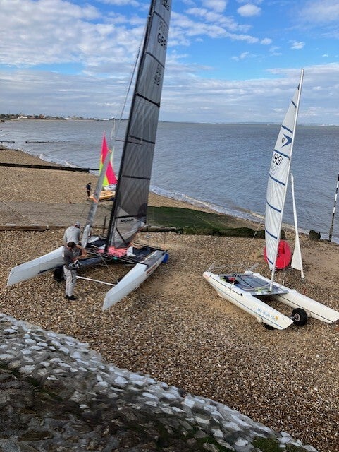 Wind building to 20/25kts and shifting 20degrees either side of the base course. It was a clean start and evenly spread across the line. 1373 getting the best start, 1383 trying to tack off and make use of the now changing tide but was held by the fleet and nearly capsized to windward. It didn’t matter as once 1383 was clear they pulled ahead, Leading round the windward mark and onto the run. The fleet was tight, but 1383 was first to the zone by the leeward mark, however…. What looks like a tiller extension failure turned the boat just before the mark and allowed the entire fleet to pass. The reach to the wind was fast. Only 2 boats risking the kite in a strengthening wind. The speed deferential was phenomenal. 1349 (Shaw/Little) entering hyperspace as the passed 2 boats in a matter of seconds. 1116 maintained the lead at the gybe mark and hoisted the kite to pull away from 1373 (Marshall/Dixon). The final run saw all 4 leading boats together. Shouting for room but clearly no overlaps. 1116 did a perfectly executed gybe but then failed to head up tight straight away allowing 1314 & 1349 to creep in above. The crisscrossing continued up the beat and along the reaches. 1349 (Shaw/Little) took the win, but the excitement came from 1116 & 1314 with a photo finish. Again the RO unable to hoot quick enough but 1314 just pipped 1116 by a cats whisker.